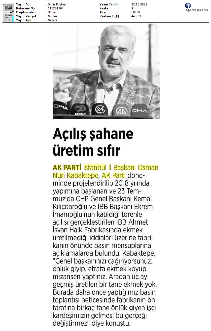 İl Başkanımız Osman Nuri Kabaktepe'nin İBB Halk Ekmek Açıklaması- Diriliş Postası